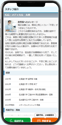医院紹介ページでは、プレミアムプラン、スタンダードプランをご用意しております。 プレミアムプランでは医院様の外観・内観写真を掲載し、ユーザーに医院の雰囲気を知ってもらったり、施術内容やこだわりポイントの掲載が可能です。 専門のライターが医療広告ガイドラインに基づき、ページを作成しますので先生のお手間はかかりません。 一部、掲載ページを以下にご紹介いたします。